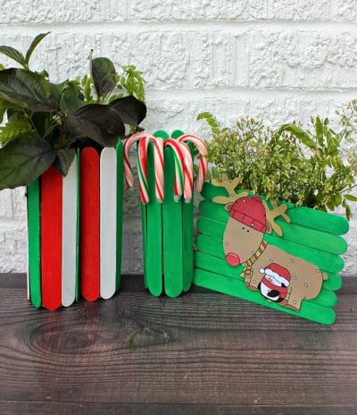 I first made a popsicle stick vase for Valentine’s Day party favors and have continued with a Christmas theme. Directions to make the Popsicle Stick Vase are available here.